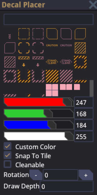 Mappers now have another new tool in their arsenal, the Decal Placer. It’s a handy little menu for adding tile decals with the ability to easily change the color, rotation, and whether or not the decal can be cleaned up.